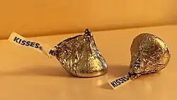![]() Hershey's Kisses in foil wrappers. The paper strip coming out the top identifies each flavor. | |