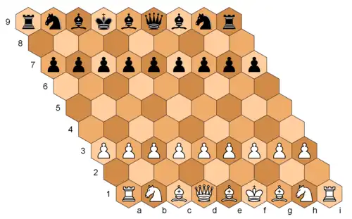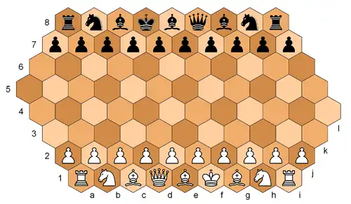 The game is played on a vertically oriented regular hexagonal board with sides 6 cells long, which has 91 hex cells having three colours (light, dark, and mid-tone), with the middle cell (or "hex") usually mid-tone.[5] The usual set of chess pieces is increased by one bishop and one pawn. The board has 11 files, marked by letters a–l (letter j is not used), and 11 numbered ranks (which bend 60° at file f). Ranks 1–6 each contain 11 cells, rank 7 (filled with black pawns in the initial setup) has 9 cells, rank 8 has 7, and so on. Rank 11 contains exactly one cell: f11.