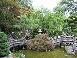 The entrance to the Japanese garden features stone guard dogs and a tall granite lantern. A stream cascades along the hillside and pools appear as well, with stones placed in them to provide safe crossing. A figurine of Hotei, a small sculpture of a tortoise and small Tōrōs are found throughout. Designed by landscape architect Shogo Myaida, the garden combines native and Japanese plants including Japanese pines, Colorado blue spruce, maples, azaleas, and false cypress.[2]