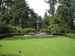 A simple English inspired garden walk was a gift to Post from her friends in 1957. It is lined with boxwood, rhododendrons, and azaleas.[2]