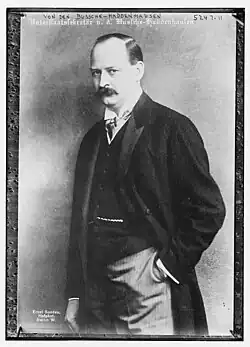 He then began to organize preparations for Argentina, arriving in Buenos Aires at the beginning of 1897, taking a position at the German embassy there. He replaced Friedrich von Mentzingen as chargé d'affaires the following year on 1 July 1898.[3] He left Argentina a year later and was assigned to Egypt, working at the German embassy in Cairo on 26 February 1900 under chargé d'affaires Maximilian von Loehr. He stayed in Cairo for two years becoming legation councilor in October 1902 before moving to the German embassy in London on 30 October 1902. He served in London as Second Secretary of the Embassy under Ambassador Paul Wolff von Metternich. His assignment was brief as he was assigned to the German embassy in Washington, D.C. on 2 July 1903 as First Secretary of the embassy under Ambassador Hermann Speck von Sternburg before becoming embassy counselor the following year.[4] Bussche-Haddenhausen's served in Washington until May 1906,[5][6] when he returned to the Foreign Office in Berlin in the Politics Department working, primarily, as a department head for English affairs. Shortly before his return to Argentina where he replaced Julius von Waldthausen, he became a Privy Legation Councilor on 17 May 1909.[3] At the beginning of 1910, he returned to Buenos Aires as Envoy also responsible for the tasks in Paraguay. He served in that role for four years, until his mission ended shortly before the outbreak of World War I.[7]