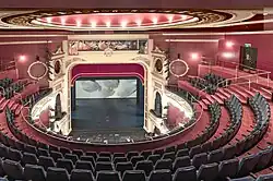 The auditorium contained a proscenium arch,[16] with a raked stage 20 by 23 metres (66 by 75 ft) in size.[17] The auditorium measured 23 by 21 metres (75 by 69 ft),[17] and its original capacity was 2584 people in three tiers.[2] The interior of the theatre was a typical Edwardian horseshoe-shape to bring the audience closer to the performers.[2][17] It featured stalls (seating 974), a dress circle (seating 540), an upper gallery (seating 1,074) and private boxes.[2][5]