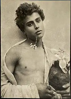 The homoeroticism present in Andalusian poetry establishes a type of relationship similar to that described in ancient Greece: the adult poet assumes an active (top) role against an ephebe who assumes the passive (bottom) one,[6] which came to produce a literary cliché, that of the appearance of the "bozo",[7] which allows, given the descriptive ambiguity of the poems, both in images and grammatical uses, to identify the sex of the lover described.[1] Much of the erotic-amorous poetry of the period is devoted to the cupbearer or wine pourer, combining the bacchic (خمريات jamriyyat) and homoerotic (مذكرات mudhakkarat) genres.[8]
