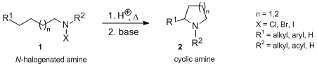 In organic chemistry, the Hofmann–Löffler reaction (also referred to as Hofmann–Löffler–Freytag reaction, Löffler–Freytag reaction, Löffler–Hofmann reaction, as well as Löffler's method) is a cyclization reaction with remote C–H functionalization.[1] In the reaction, thermal or photochemical decomposition of N-halogenated amine 1 in the presence of a strong acid (concentrated sulfuric acid or concentrated CF3CO2H) generates a nitrogen radical intermediate. The radical then abstracts an intramolecular hydrogen atom to give a cyclic amine 2 (pyrrolidine or, in some cases, piperidine).