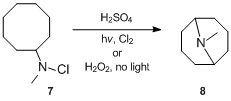 Another example of the construction of a bicyclic amine through the standard Hofmann–Löffler–Freytag methodology is the Waegell's synthesis[33] of azabicyclo[3.2.1]octane derivative 53.