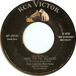 Como's second recording of "Home for the Holidays", in stereo and with a different musical arrangement by Joe Lipman, was made on July 15, 1959. It was released as a 33 rpm single,[6] with flip side "Winter Wonderland", by RCA Victor in the U.S. and as a 45 rpm single by His Master's Voice in the UK.[7] This 1959 version was also included on the album, Season's Greetings from Perry Como, and has appeared on many compilations, as well as being played on some radio stations during the holidays.
