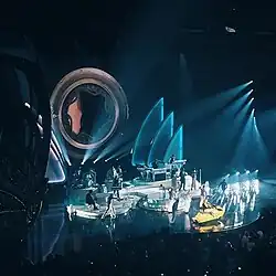 For her Rainbow World Tour (2000), Carey re-enacted a similar performance than that of her previous tour, with her and her dancers wearing sailor-inspired outfits.[33] "Honey" was performed during Carey's following tour, the Charmbracelet World Tour (2003–2004).[34] Carey continued performing the song throughout her 2006 tour, The Adventures of Mimi. The performance did not include any video intro, but did introduce a four-piece of male dancers dressed in sailor outfits. Carey wore a pair of black leggings, accompanied by a sparkling mini-bra. During the performance in Madison Square Garden, Carey was joined with Sean "Diddy" Combs (previously known as Puffy) on stage after the second verse. During her Angels Advocate Tour (2010) performance of the song, Carey donned a sparkling mini-Herve Leger gown, with a faux-fur snug jacket. During the song, male and female dancers joined her on stage, and performed up-tempo dance routines. She performed the song regularly during The Elusive Chanteuse Show (2014), singing the So So Def Mix. She also included the song in her 2015 Las Vegas residency, Mariah Carey Number 1's, where she would enter the stage in a black leotard, riding a yellow jet ski, in homage to the video. Carey started performing "Honey" for the first time since July 2017 on her second concert residency, The Butterfly Returns (2018).