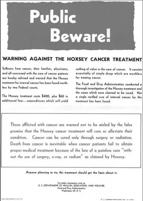 The United States National Cancer Institute (NCI) and Food and Drug Administration (FDA), as well as the American Medical Association (AMA), began a series of efforts to restrict Hoxsey's clinic operations, viewing them as providing false cures and defrauding cancer sufferers. Regarding this campaign, NCI director John Heller wrote in 1953:
