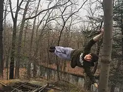The human flag (known as an iron X in pole sports)[1] is a feat of strength where the body is parallel to the ground supported by a vertical bar. A straight line is formed using the arms and body. The trick requires the performer to have extensive upper body strength.