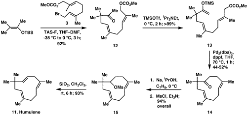 This biosynthesis can be mimicked in the laboratory by preparing allylic stannane from farnesol, termed Corey synthesis. There are diverse ways to synthesize humulene in the laboratory, involving differing closures of the C-C bond in the macrocycle. The McMurry synthesis uses a titanium-catalyzed carbonyl coupling reaction; the Takahashi synthesis uses intramolecular alkylation of an allyl halide by a protected cyanohydrin anion; the Suginome synthesis utilizes a geranyl fragment; and the de Groot synthesis synthesizes humulene from a crude distillate of eucalyptus oil.[20] Humulene can also be synthesized using a combination of four-component assembly and palladium-mediated cyclization, outlined below. This synthesis is noteworthy for the simplicity of the C−C bond constructions and cyclization steps, which it is believed will prove advantageous in the synthesis of related polyterpenoids.[21]