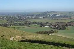 A path climbs up Whiteway Bottom to Pickers Hill and on the top there was a barrow field. It is ploughed out now. When the sun is low you can see bold prehistoric field lynchets at the head of the Whiteway combe (TQ 391 052), and back towards Highdole in the Rodmell parish, as well as up the dean around Long Bottom. The south slope of Whiteway Bottom (TQ 396 054) is a tranquil old Down pasture site. It was damaged by agro-chemicals at its western end, but the middle and eastern end are intact, with lots of butterflies, including small heath, chalkhill blue, common blue and marbled white, and lots of old Down pasture herbs.[9]