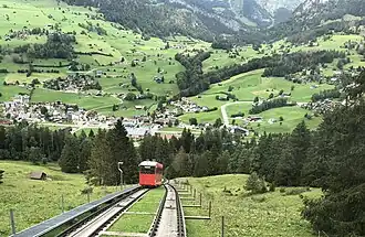 Iltiosbahn is a funicular railway in the Canton of St. Gallen, Switzerland. It leads from Unterwasser at 911 m (2,989 ft) to Iltios at 1,339 m (4,393 ft),[2] from where an aerial cableway continues to Chäserrugg (2,262 m, 7,421 ft), a peak of the Churfirsten range above Lake Walen. The line has a length of 1,195 m (3,921 ft) with a maximum incline of 27% and a difference of elevation of 428 m (1,404 ft).[2]
