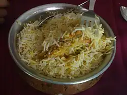 Bihari cuisine may include litti chokha,[61] a baked salted wheat-flour cake filled with sattu (baked chickpea flour) and some special spices, which is served with baigan bharta,[62] made of roasted eggplant (brinjal) and tomatoes.[63][64]
