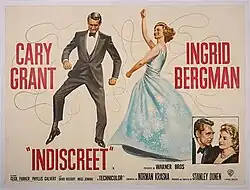 Indiscreet is a 1958 British romantic comedy film produced and directed by Stanley Donen, and starring Ingrid Bergman and Cary Grant.[2]