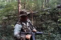A pre-production variant of the TLBV in use on 19 July 1987, by a student at the Scout Sniper Instructor School at Quantico, VA, armed with an early M4 carbine and moving through the woods while on patrol during a field training exercise