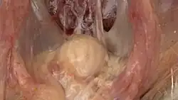 Enlarged bursa of Fabricius with yellowish peribursal oedema