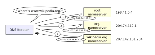 A DNS resolver consults three name servers to resolve the domain name user-visible "www.wikipedia.org" to determine the IPv4 Address 207.142.131.234.
