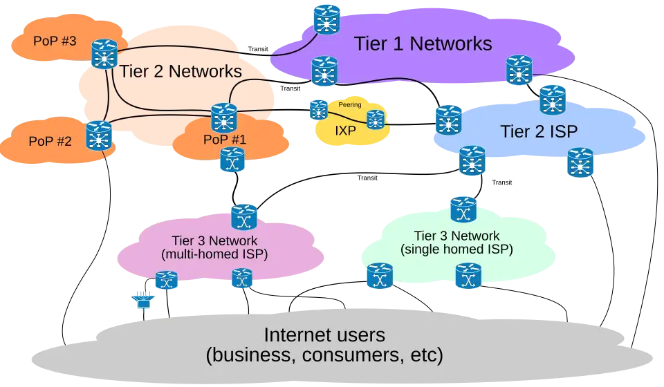 Internet service providers (ISPs) establish the worldwide connectivity between individual networks at various levels of scope. End-users who only access the Internet when needed to perform a function or obtain information, represent the bottom of the routing hierarchy. At the top of the routing hierarchy are the tier 1 networks, large telecommunication companies that exchange traffic directly with each other via very high speed fiber-optic cables and governed by peering agreements. Tier 2 and lower-level networks buy Internet transit from other providers to reach at least some parties on the global Internet, though they may also engage in peering. An ISP may use a single upstream provider for connectivity, or implement multihoming to achieve redundancy and load balancing. Internet exchange points are major traffic exchanges with physical connections to multiple ISPs. Large organizations, such as academic institutions, large enterprises, and governments, may perform the same function as ISPs, engaging in peering and purchasing transit on behalf of their internal networks. Research networks tend to interconnect with large subnetworks such as GEANT, GLORIAD, Internet2, and the UK's national research and education network, JANET.