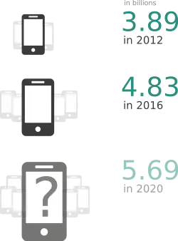 The International Telecommunication Union (ITU) estimated that, by the end of 2017, 48% of individual users regularly connect to the Internet, up from 34% in 2012.[79] Mobile Internet connectivity has played an important role in expanding access in recent years, especially in Asia and the Pacific and in Africa.[80] The number of unique mobile cellular subscriptions increased from 3.9 billion in 2012 to 4.8 billion in 2016, two-thirds of the world's population, with more than half of subscriptions located in Asia and the Pacific. The number of subscriptions was predicted to rise to 5.7 billion users in 2020.[81] As of 2018, 80% of the world's population were covered by a 4G network.[81] The limits that users face on accessing information via mobile applications coincide with a broader process of fragmentation of the Internet. Fragmentation restricts access to media content and tends to affect the poorest users the most.[80]