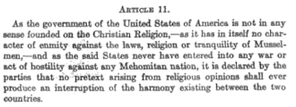 In 1797, President John Adams signed the Treaty of Tripoli, declaring the United States had no "character of enmity against the laws, religion, or tranquillity, of Mussulmen".[61]
