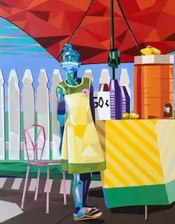 Solomon paints with bold colors and geometric shapes, often utilizing acrylic paint on large-scale canvas. Many of his works are portraits of family, friends, community members and individuals he is inspired by.[3]