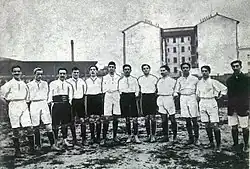 An early attempt to create an Italian national team occurred on 30 April 1899, when an Italian selection played a Swiss eleven, losing 0–2 in Torino.[2] The team's first official match was held in Milan on 15 May 1910. Italy defeated France by a score of 6–2, with Italy's first goal scored by Pietro Lana.[3][4][5] The Italian team played with a (2–3–5) system and consisted of De Simoni, Varisco, Calì, Trerè, Fossati, Capello, Debernardi, Rizzi, Cevenini I, Lana, Boiocchi, with Calì as the team's first captain.[6]