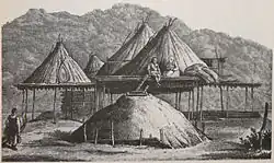 In the summer months, the Itelmens live in raised houses called pehm or pehmy. As the ground thaws in the summer, the floors of the winter houses began to flood. In the summer months, each family in the village lived in their own house, rather than sharing a large house as in winter. These raised homes, or balagans as the Cossacks called them, were pyramids on raised platforms, with a door on the south and the north side. The extreme moisture of the climate required the raising of the homes for dry storage. Most villages, in addition to summer and winter houses, contained straw huts built on the ground, which were used for cooking food, boiling salt from sea water and rendering fat. Villages were surrounded by an earthen wall or palisades until the arrival of the Russians, after which this practice was banned.[4]