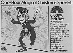Jack Frost is a 1979 Christmas, Winter and Groundhog Day stop motion animated television special produced by Rankin/Bass Productions.[2] It is directed by Jules Bass and Arthur Rankin Jr., written by Romeo Muller, narrated by Buddy Hackett, and starring the voices of Robert Morse, Debra Clinger and Paul Frees.[3] The special premiered on NBC on December 13, 1979, and tells the tale of Jack Frost and his adventures as a human.[4] It airs annually on AMC as part of its Best Christmas Ever programming block.