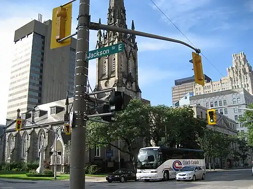 Jackson Street, is a Lower City collector road in Hamilton, Ontario, Canada. It starts off West of Locke Street South at Jackson Playground as a one-way street (Westbound) up to Queen Street South where it then switches over to a two-way street and is interrupted at Bay Street South the site of the Hamilton City Hall and the Canadian Football Hall of Fame (museum), resumes again East of the property on MacNab Street South and then ends at Wellington Street South.