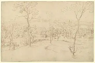 In his earliest landscape drawing of a View over a tree-covered hill towards a village on a river (1573, Kunsthalle Hamburg) and in the series of paintings of the Four Seasons (1577, Museum of Fine Arts (Budapest) Jacob Grimmer showed a preference for depicting realistic flat Flemish landscapes with villages and farmhouses and populated with rural residents.[7] The small figures in these scenes are set in graduated zones of recession along rolling hills towards a horizon in the middle of the panel.[8] These landscapes with figures and small anecdotal scenes are rendered in a naturalist manner. Grimmer abandoned the contrived world landscape of the earlier generation in favour of a simplicity and authenticity never seen before.[2]