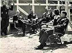 In November, he returned to the United States,[36] and was assigned to Marine Barracks, Washington, D.C., again under William Rupertus until June 1940. In March 1940, he became a company commander in the Marine Guard detachment at President Franklin D. Roosevelt's personal retreat at Warm Springs, Georgia, under the command of LtCol Charles T. Brooks, and became close to the president during an extended retreat.[37] At one point, the guards performed silent exhibition drill for the president and patients [38] at the Roosevelt Warm Springs Institute for Rehabilitation.
