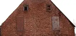 The truly principal feature of this gable, however, are die initials "T" and "I V H" worked in the masonry in black clinker brick headers. These are the monograms of the first occupants of the house, Jan van Hoesen (1687–1745) and his wife Tanneke. The "T" stands for Tanneke, given name of the wife of Jan Van Hoesen, Tanneke Wittbeck. The letters "V" and "H" stand for Jan's family name Van Hoesen. Jan's given name is represented by the letter "I", which is the Dutch representation of the letter "J".[2]