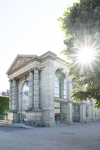 From 1989, as part of the Grands Projets of François Mitterrand, the building underwent a $10 million renovation by architect Antoine Stinco, resulting in about 1180 square metres (12,700 square feet) of exhibition space spread across three floors. The formerly walled-in reception hall was transformed into an atrium-like open area flooded with natural light from large bay windows, allowing views of the neighboring Tuileries Gardens, Place de la Concorde, and Eiffel Tower.[4] The top floor features a series of galleries lit by skylights.[11]