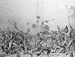 Jacob Friedrich Ludwig Lentin's Medizinische Bemerkungen auf ein literarischen Reise durch Deutschland (1800) talked about German medicine being dominated by the struggles of Brunonians and "anti-Brunonian terrorists."[15] There are also reports of 400 students rioting in a dispute between the two sides in the German university city of Göttingen in 1802.[16] One critic of John Brown's theory was August von Kotzebue, who wrote plays to reflect his disdain for this theory of medicine. In his plays he would portray Brunonianism and doctors who practiced this method in a negative light. Magazines and newspapers in Germany also reflected varying ideas on John Brown's system, some positive and some negative and critical. Röschalub's Magazin would support Brunonian medicine and promoted the system amidst criticisms from other publications at the time. Discussion on John Brown began to cease after 1809 with the end of Röschalub's Magazin. During a typhoid outbreak in 1813–1814 Brown's Brunonian medicine was briefly referenced as Germans attempted to remedy the illness.[7] By 1817, however, the German historian of medicine Kurt Sprengel suggested that Brunonian medicine "has very few supporters."[17] Once again, Brunonian medicine came back in the 1820s, and was in the spotlight again as François-Joseph-Victor Broussais rose to fame. Broussais, a French physician, was becoming very popular in the beginning of the 1820s and his medicinal theory was based on John Brown's own Brunonian medicine. Brown had also become a famous historical figure in Germany by 1846, when Bernhard Hirschel published a study on his system and the effects of Brunonian medicine. However, Brunonianism began to decline as physicians did not believe is adequately provided a scientific explanation to diseases and illnesses.[7]