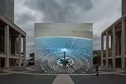 Solar Reserve (Tonopah, Nevada) 2014 features a simulated landscape showing computer-generated images of a solar thermal power plant in Nevada, whose central tower is surrounded by 10,000 mirrors which reflect sunlight onto it to heat salt to high temperatures, forming a thermal battery which is used to generate electricity. Over the course of a 365-day year, the work replicates the movements of the sun, moon, and stars across the sky as they would appear at the Nevada site. The mirrors adjust their positions in real time according to the position of the sun. Over a 24-hour period the virtual camera view of the tower shifts, following the movement of the mirrors, from ground level to an overhead satellite view.[11]