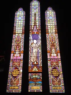Valentine died on December 21, 1901, in Oakland, California.[8] At Valentine's funeral on December 23, 1901, Advent Episcopal Church "was filled to overflowing and a choir of nearly 50 took part...outside, the funeral procession included a large Wells Fargo express wagon draped with flowers. California Bishop Nichols spoke of Valentine as the 'honored and honest head' of a large corporation who was 'Christian in conviction, in conduct' and who had a 'warm heart for his fellow man.' Though this was the era of "robber barons," it was his delight to say that the profits were distributed to '20,000 persons scattered all over the country, and that many were widows and orphans. Valentine frequently became aware of local disasters at points throughout the nation where Wells Fargo maintained offices. So he often began campaigns for relief funds for the needy throughout the nation. John J. Valentine was reputed to be a compassionate gentleman, so honored at his funeral."[9] Advent Episcopal Church became St. James the Apostle Episcopal Church, which is still located at the 12th Avenue address. The church contains a phenomenal glass window commemorating his wife Mary F. Valentine and two of their children who died at 2+1⁄2 years old and 10 months old.