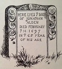 Jonathan Alden died on February 14, 1697, in Duxbury, leaving an estate of £309 (about US$67,500 in 2022).[18][19] He was given a military funeral and "buried under arms." He was interred near his parents in Myles Standish Burial Ground, the oldest maintained cemetery in the United States.[20][21]