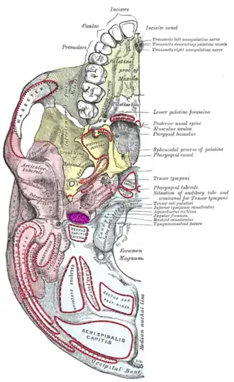 Base of the skull. Inferior surface. Jugular fossa labeled in purple near center. | |