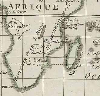 Following Leo Africanus, the works of Richard Hakluyt designate this population as "Cafars and Gawars, that is, infidels or misbeleeuers".[8][9] He uses a slight variation in spelling, referring to slaves ("slaues called Cafari") and certain inhabitants of Ethiopia, who, he says, ("vse to goe in small shippes, and trade with the Cafars"). The word is also used in allusion to a portion of the coast of Africa ("land of Cafraria").[10] On early European maps of the 16th and 17th centuries, Southern Africa northwest of the "Hottentots" (Khoikhoi) was likewise called by cartographers Cafreria.