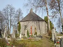 The parish graveyard is on the west side of the town. There is an octagonal wooden folk architecture chapel on the hill, built in 1798 and restored in 1989. There are also many saints’ sculptures on the same hill.