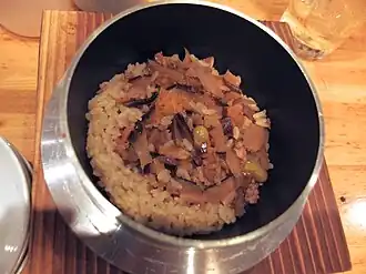 Kamameshi (釜飯 "kettle rice") is a Japanese rice dish traditionally cooked in an iron pot called a kama. Many varieties exist, but most consist of rice seasoned with soy sauce or mirin, and cooked with meats and vegetables. In modern times, it is often considered a type of takikomi gohan (mixed rice dish).