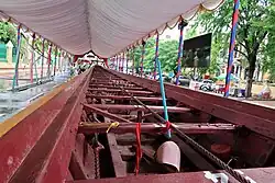 The boat was built to remember the history of production and use of dragon boats by the Khmer people and Khmer kings in older times, who used dragon boats as means of transport to defend the territory.[2] The boat was built by Union of Youth Federations of Cambodia at an overall cost of US$60,000 (equivalent to $75,131 in 2024). Construction of the boat began in April 2018 and it took nearly seven months to finish the construction. The boat measures 87.3 metres (286 ft) in overall length, 1.99 metres (6.5 ft) in width and it can accommodate 179 oarsman.[3][4][5] More than 13,000 people participated in the construction of the boat and it was completely hand-made.[6]