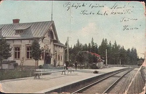 The project of the old Ostrobothnian railway from Tampere to Vaasa via Haapamäki and Seinäjoki was initiated during the end of the 1870s. During the planning stages of the line, a dominant question was whether it should be built around the western or eastern side of lake Näsijärvi. The eastern option was settled on, making it cut through the municipality and parish of Kangasala through its northern side, some 5 kilometres (3.1 mi) away from the parish village. The construction of the railway was initiated in 1879, completed in 1882, and it was opened for traffic in 1883.[2] On the territory of Kangasala were the villages and stations of Suinula and Siitama, further away from the municipal church to the north, with the former most commonly being used by travellers bound for the surroundings of the church.[3] The Halimaa halt was opened in 1888 to serve the parish village,[4] being placed about 5 kilometres (3.1 mi) further towards Tampere compared to Suinula.[1] A post office was opened at the halt on 1 June 1895.[3]