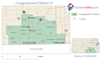 Kansas's 4th congressional district is a congressional district in the U.S. state of Kansas. Based in the south central part of the state, the district encompasses the city of Wichita, the largest city in Kansas, three universities, Arkansas City, and the State of Kansas's only national airport.
