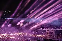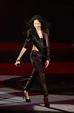 Mok performing at her concert in Shanghai on 23 June 2018. The Regardez Tour (2015–2016) started in Taipei and led Mok to 27 cities in Asia, North America, Europe, Australia, and New Zealand.[ 20] [ 21] As part of this tour, she was the first Chinese pop artist to give solo concerts in Madrid and Milan.[ 22]