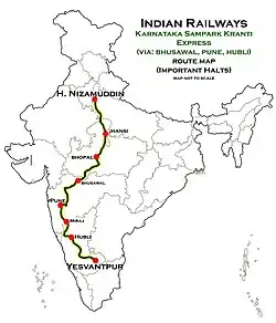The 12629 / 12630 Karnataka Sampark Kranti Express is a Sampark Kranti Express train belonging to South Western Railway Zone that runs between Yesvantpur Junction and Hazrat Nizamuddin in India. It is currently being operated with 12629/12630 train numbers on a biweekly basis.[1][2][3][4]