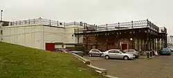 Through a door at the south-west corner of the main hall (now the vestibule) there was a York stone staircase to the roof and road, with 13 inches (33 cm) deep by 6 inches (15 cm) high by 4 feet (1.2 m) wide treads and a wrought iron handrail. The terraced roof, which as of 2013 still exists, was intended for promenade concerts with an audience of 700. It runs over to cover the verandah supported by iron columns and ornamental ironwork supplied by MacFarlane & Co of Glasgow in 1904 and still visible today. The bandstand (demolished 1969) had a "roof supported by slender iron pillars and fenced with elaborately designed ironwork." At the east and west of the building there were Victoria stone drinking fountains (the eastern one was still visible as of 2011). The walls, wood and ironwork were painted with Velure.[12][31]