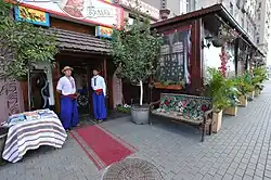 The menu represents traditional Ukrainian cuisine dishes: nourishing borshch with pampushky (garlic donuts), dumplings, pancakes with various fillings, chicken Kiev (cutlets a-la Kyiv). “Korchma Taras Bulba” offers homemade potions and wines, liqueurs, Russian vodka or Ukrainian gorilka.[6] There is a special "express menu". * All agricultural products for “Korchma Taras Bulba” are grown at own farm "Kazachie" Ltd., situated in Ryazan Region.