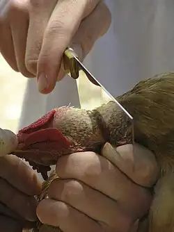 To avoid tearing, and to ensure the cut is thorough, such slaughter is usually performed by a trained individual, with a large, razor-sharp knife, which is checked before each slaughter to ensure that it has no irregularities (such as nicks and dents); if irregularities are discovered, or the cut is too shallow, the meat is deemed non-kosher.