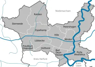 This is the northernmost district of North Rhine-Westphalia. It protrudes into Lower Saxon territory. The Weser River enters the district in the southeast and leaves to the north. In the south of the district the river runs through a narrow gorge, which is formed by two mountain chains, the Wiehen Hills in the west and the Wesergebirge in the east. This gorge is called Porta Westfalica, since it marks the ancient border of Westphalia.